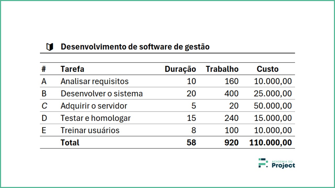 Neste exemplo, vamos analisar cinco tarefas de um projeto que visa desenvolver e implantar um novo sistema de gestão para uma empresa. Cada tarefa tem sua respectiva duração, custo e trabalho (ou homem-hora).