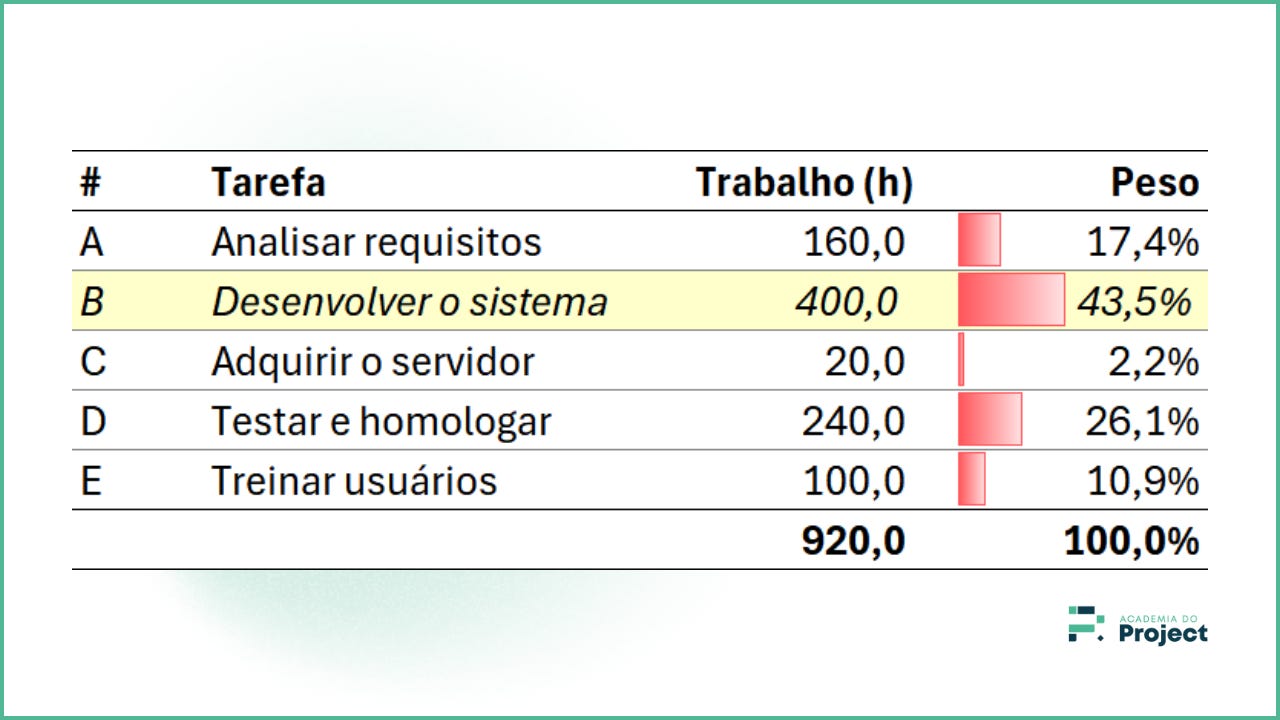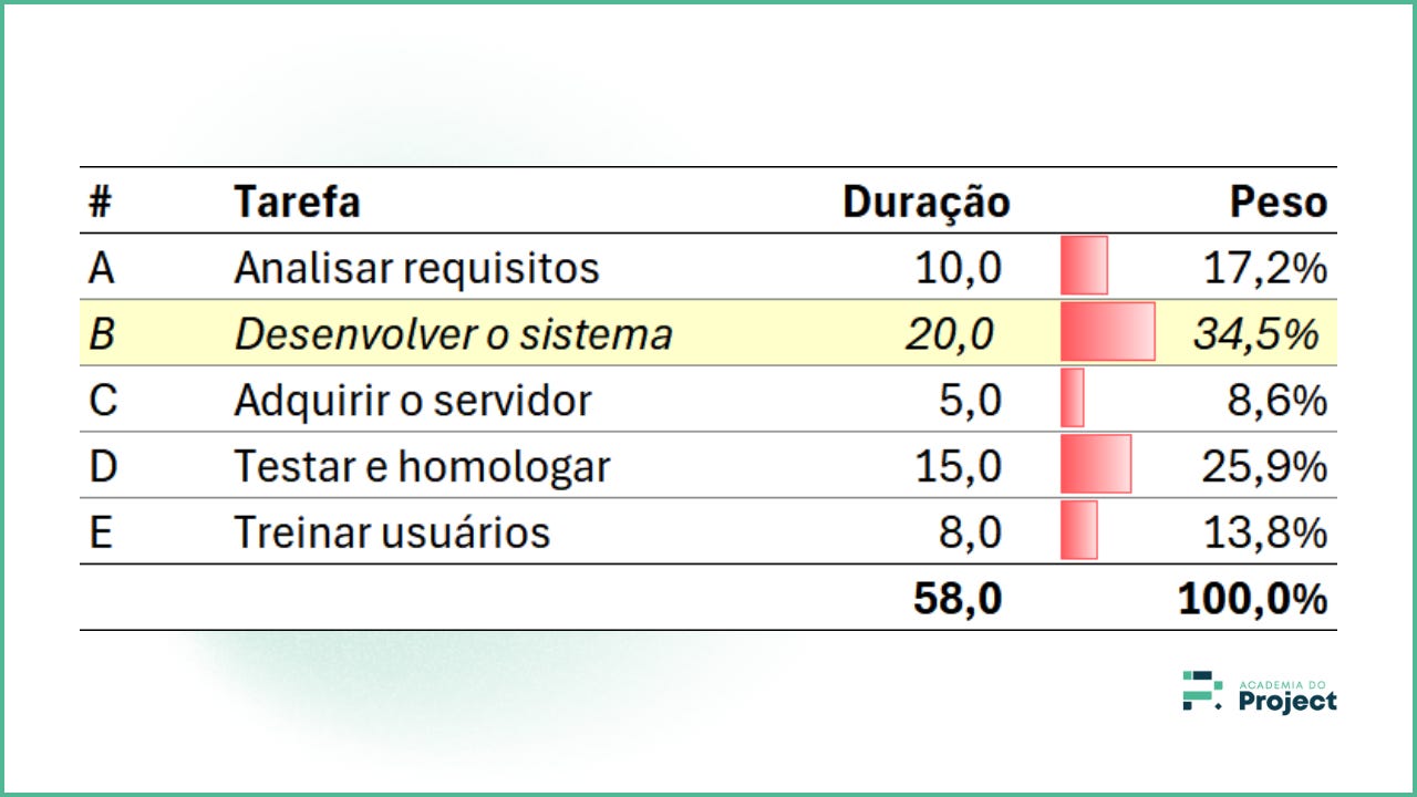 A ponderação por duração também destaca a tarefa B (Desenvolver o sistema) como a tarefa mais significativa. Veja que este método também pode mascarar o peso das tarefas. Por exemplo, a duração pode ser influenciada por períodos de espera ou devido à alocação de poucos recursos.